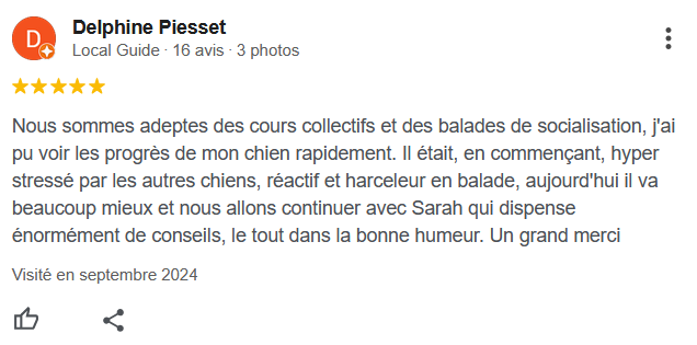 Des groupes sur-mesure en fonction du tempérament de chaque chien et de vos dispos. Cela permet aux chiens de progresser dans leur communication et de combler leur besoin sociaux, et aux humains de mieux lire les interactions canines pour les gérer de la meilleure façon.