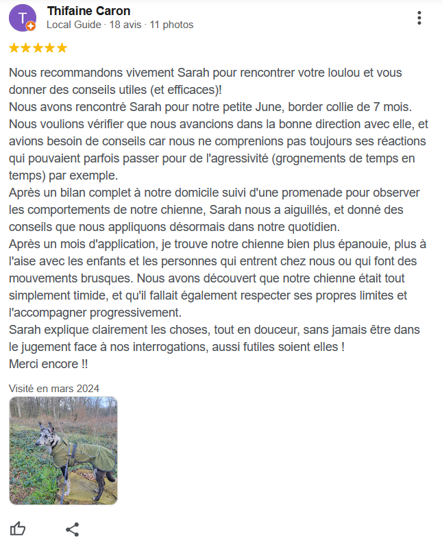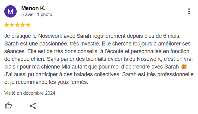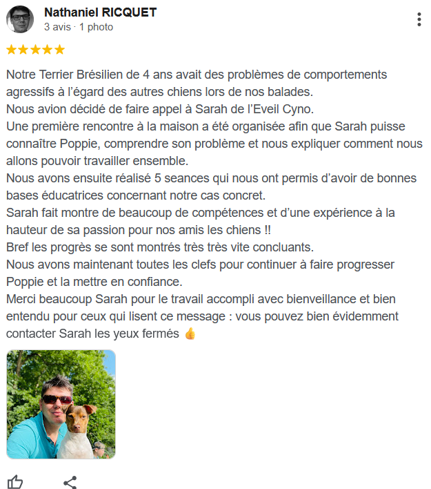 Attention, bilan individuel obligatoire avant l’intégration à ces balades. Si le chien présente des problématiques liés aux congénères, un suivi individuel peut être requis. C’est ce qui me permet de constituer des groupes de chiens pertinents pour tout le monde.
